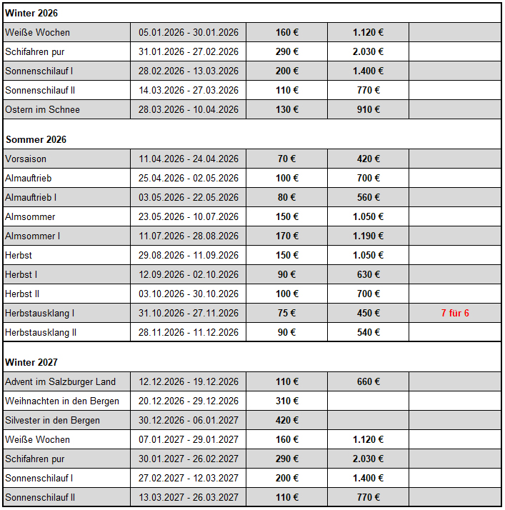 für Endreinigung, Handtücher, Bettwäsche, Energie (Gas, Wasser, Strom), WiFi und Hallenbad.